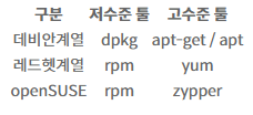 - Redhat 계열 (CentOS, Fedora) : rpm / yum (low/high)