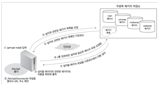 apt-get (Advanced Packaging tool) : 저장소 url 을 /etc/apt/source.list 에 작성하여, 인터넷으로 해당 저장소에서 파일 다운로드 및 설치.