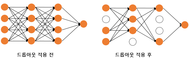 드롭아웃은 학습 과정에서 신경망의 일부를 사용하지 않는 방법입니다.